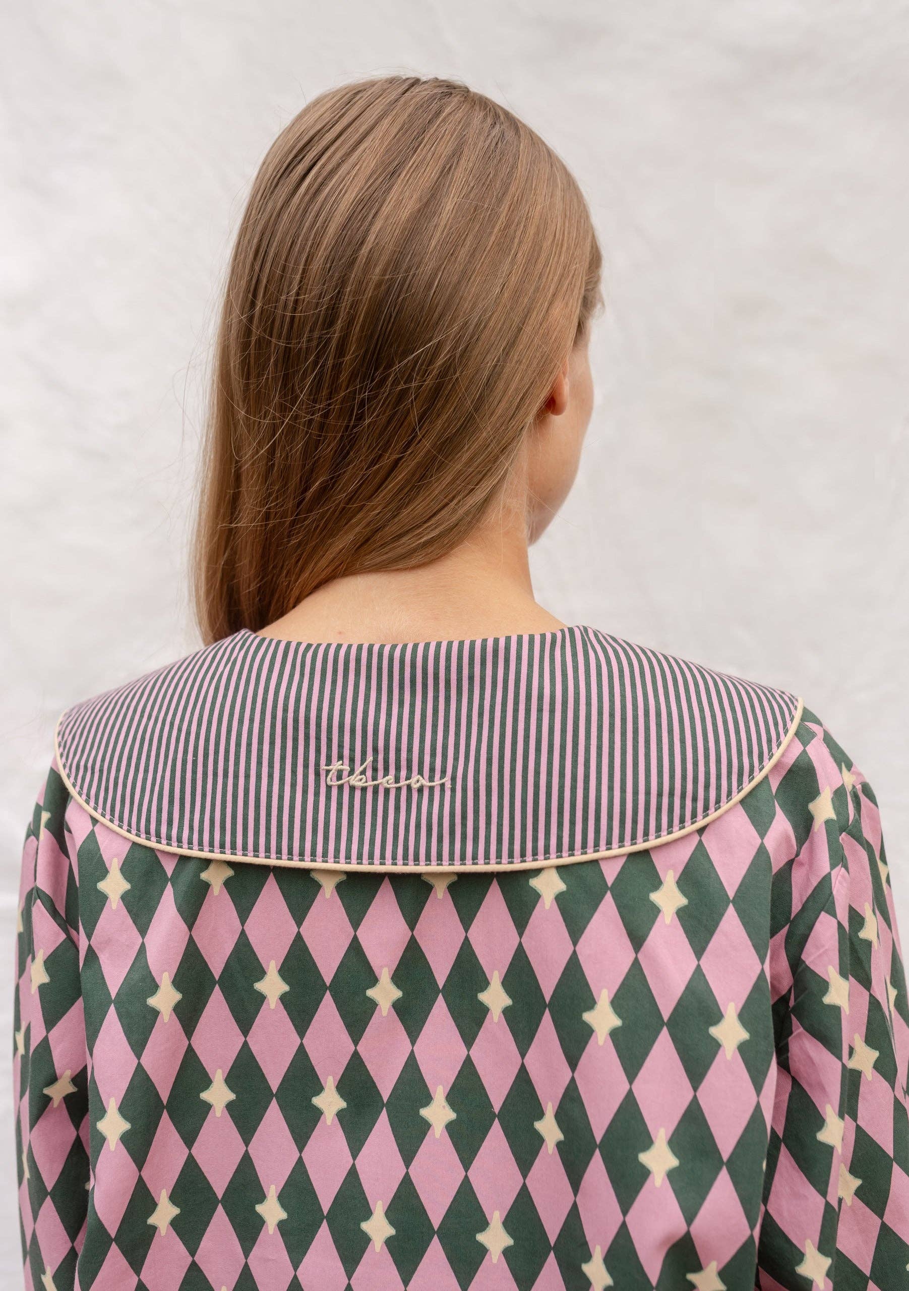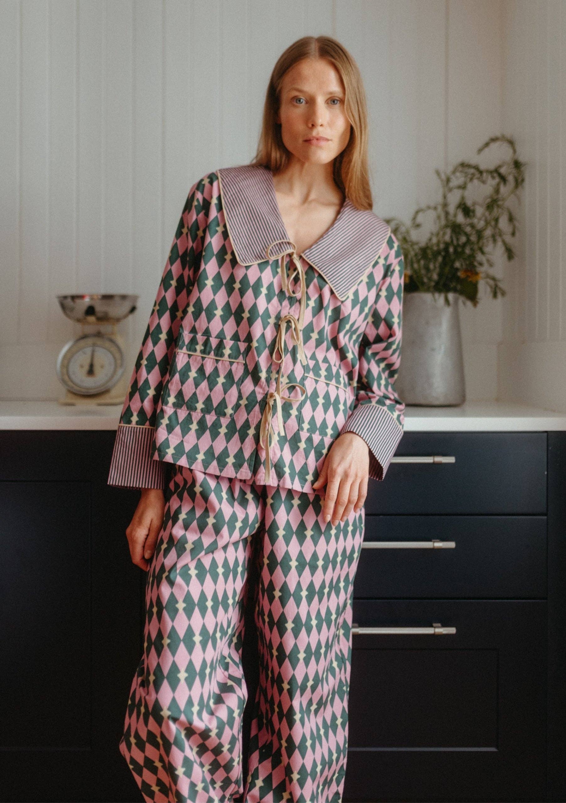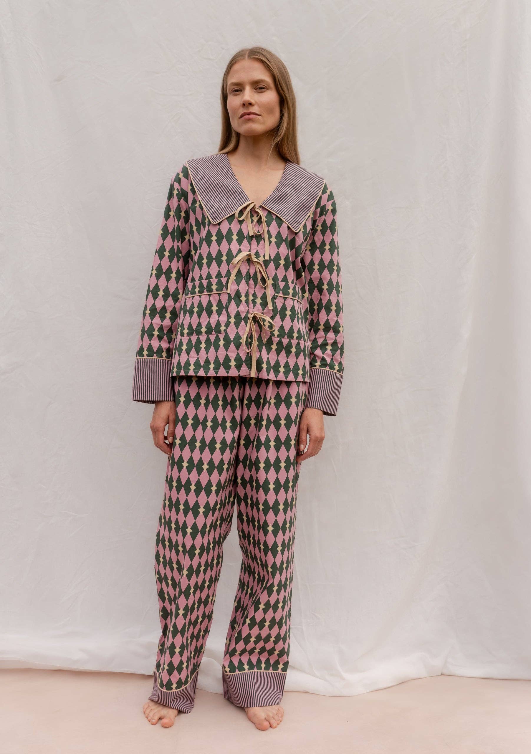Crafted from 100% breathable cotton poplin, they feature a playful pink and green harlequin diamond pattern, with contrasting camel bow ties and piping. Finished with a striped oversized collar and cuffs, plus two handy pockets and an elastic waistband for everyday ease. Includes a matching scrunchie and cotton drawstring bag, perfect for storage when you travel.